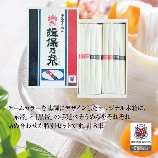 チームカラーを基調にデザインした揖保乃糸オリジナル木箱と、赤帯(上級品)4束・黒帯(特級品)4束を詰め合わせた商品。