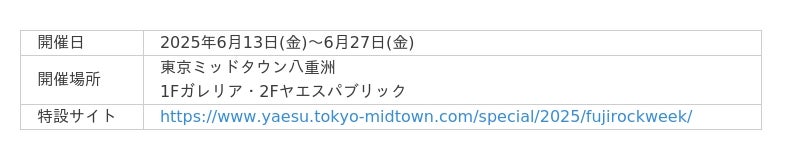 フジロックにゆかりの深いアーティストによるフリーライブやDJイベント、ワークショップを開催するほか、ヤエスパブリック×フジロックのコラボキャンペーンがパワーアップし、苗場でおなじみのドリンクがヤエパブ内のお店で楽しめるなど、東京の真ん中・八重洲でフジロックをひと足先に楽しめるイベント FUJI ROCK WEEK 2025 at 東京ミッドタウン八重洲本日6月13日(金)~27日(金)に渡って開催します。