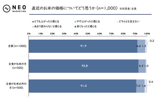直近のお米の価格が「とても上がったと感じる」と回答した割合について、主食がお米の方で92.8%、主食がお米以外の方でも91.0%と同等程度に達し、全体では91.9%となりました。
