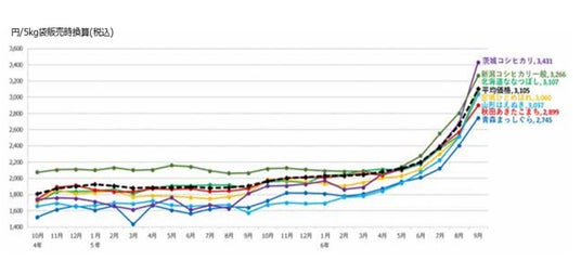 以下の図は、農林水産省が発表したお米5kgあたりの平均価格(令和6年9月時点:3,105円)です。