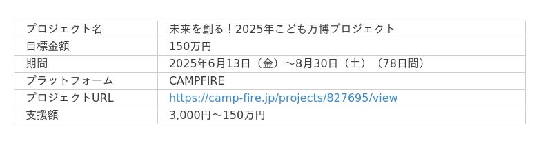 デジタル空間やeスポーツを活用して地域課題を解決する株式会社Meta Osaka(所在地:大阪府大阪市、代表取締役:毛利英昭、以下Meta Osaka)は、こども万博実行委員会として、2025年10月10日・11日にEXPO2025大阪・関西万博で開催する「未来のトビラをひらく『こども万博』」に向け、開催まで残り119日となる6月13日より、クラウドファンディング「未来を創る!2025年こども万博プロジェクト」を開始いたします。集まった資金150万円は全額、万博の舞台で発表される子どもたちの夢を実現させるために活用します。 一口3,000円から参加できる市民参加型の「夢実現プロジェクト」として、広く支援を募ります。