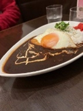 食べ応えも満点。大きめにカットされたビーフがゴロゴロと入っており、一口ごとに肉の満足感と旨味が広がります。そして、ぜひ試していただきたいのが、とろける半熟の目玉焼きトッピング。黄身を絡めることで、濃厚なカレーにまろやかさが加わり、また違った表情を楽しむことができます。
