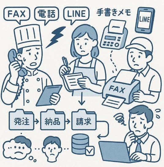 これまでの飲食業界では、FAXや電話、LINE、手書きメモといったアナログな手段による発注が主流でした。また、店舗ごと、業者ごとに管理手段が異なるため、「発注→納品→請求→支払」までの情報が分断され、管理コストやヒューマンエラーが常態化していました。