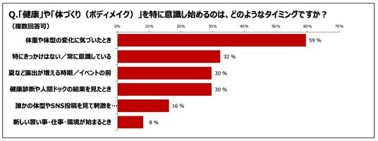今回のアンケート結果から、「健康」や「体づくり(ボディメイク)」を意識し始めるタイミングとして最も多かったのは