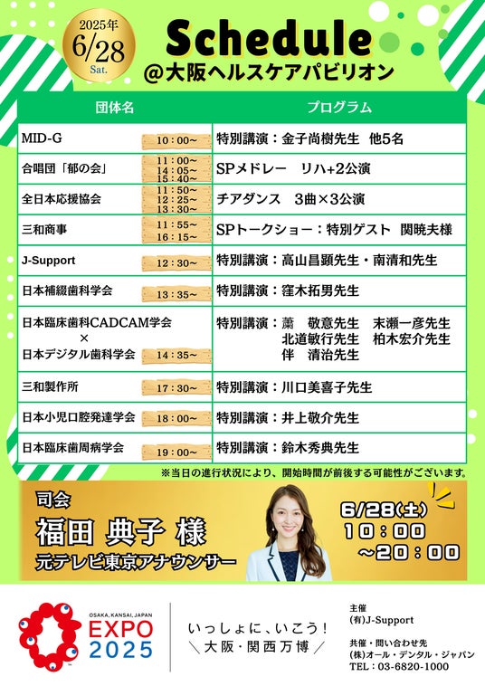 株式会社オール・デンタル・ジャパン(https://all-dental-japan.com/)は、2025年6月28日(土)に大阪ヘルスケアパビリオンで開催される有限会社J-Support(https://j-support.pro/)主催の催事に共催し、特別な1日をお届けします。