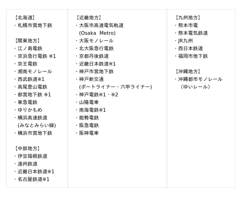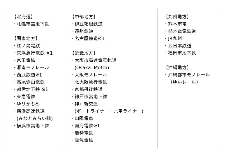 利用可能な鉄道事業者:(2025年6月12日現在、地域別五十音順)