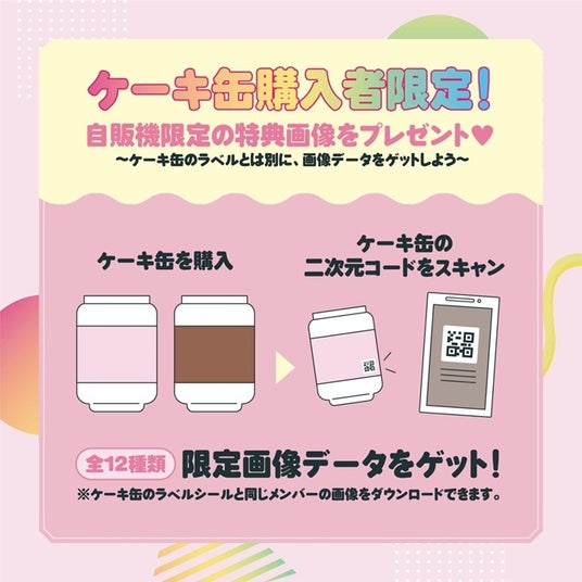 自動販売機でケーキ缶を購入すると、オリジナルの待ち受け画像を手に入れることができます!ケーキ缶裏面の二次元コードを読み込むと、オリジナル待ち受け画像にアクセスできます。デザインは全12種類(ハート)ケーキ缶のラベルシールと同じメンバーの画像をダウンロードできます。ご購入の際は、ぜひチェックしてみてくださいね。