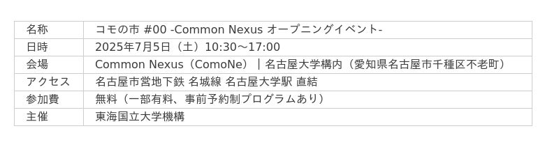 株式会社ロフトワーク(本社:東京都渋谷区、代表取締役社長:諏訪光洋)は、国立大学法人東海国立大学機構(所在:愛知県名古屋市、以下:機構)と連携し、名古屋大学構内に新たな共創施設「Common Nexus[コモンネクサス]、愛称:ComoNe[コモネ])」をプロデュースしました。開館を記念して、7月5日(土)にどなたでも自由に参加できる「コモの市 #00 ーCommon Nexusオープニングイベントー」 を開催します。