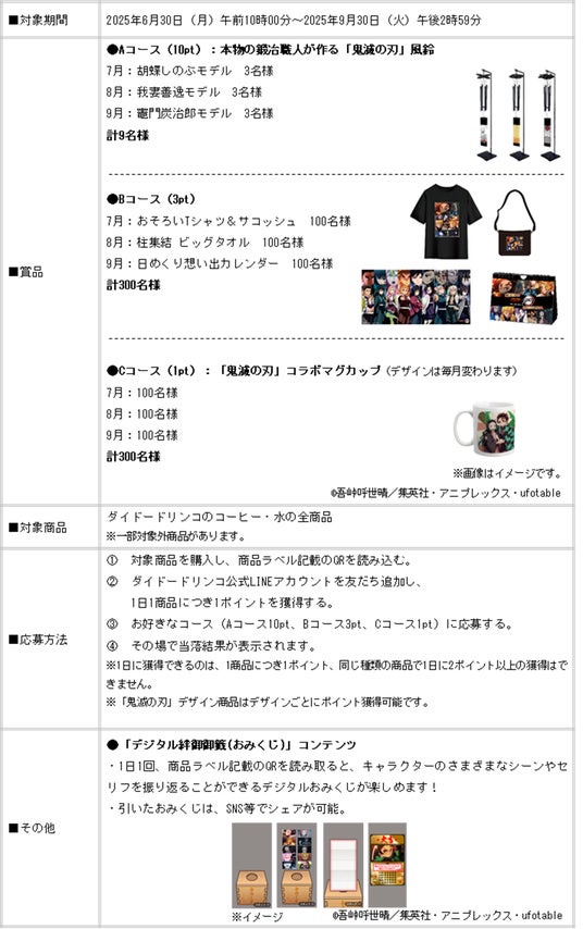 ダイドードリンコ株式会社(本社:大阪市北区、代表取締役社長:中島 孝徳、以下「当社」)は、2025年春夏の新商品として、アニメ「鬼滅の刃」とコラボした「ダイドー 鬼滅の刃アイスラテ」「ダイドー 鬼滅の刃みかん水無糖」の発売に合わせて、6月30日(月)より『飲んで!その場で当たる!DyDo×「鬼滅の刃」キャンペーン 想いをつなぐ!あのシーンを振り返ろう!』(以下「本キャンペーン」)を実施いたします。