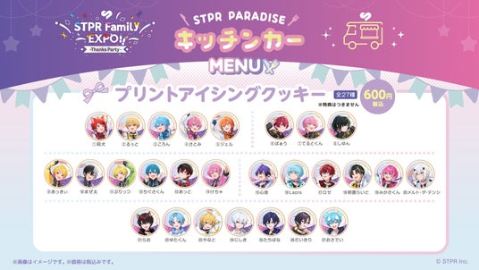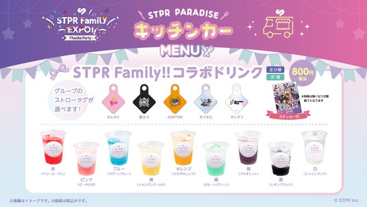 キッチンカーでは、グループロゴ入りのストロータグと推し色を組み合わせて楽しめる「STPR Family!!コラボドリンク」や、『STPR Family EXPO!! -Thanks Party-』のビジュアルを使用した27種の「プリントアイシングクッキー」など、見て・食べて楽しめるオリジナルメニューを展開。ハイタッチ会や握手会、展示といったリアルイベントとあわせて、「美味しい」&「楽しい」をお届けします。