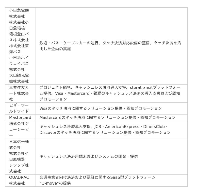 小田急電鉄株式会社、株式会社小田急箱根、箱根登山バス株式会社、株式会社東海バス、小田急ハイウェイバス株式会社、大山観光電鉄株式会社、三井住友カード株式会社、ビザ・ワールドワイド・ジャパン株式会社、Mastercard、株式会社ジェーシービー、日本信号株式会社、QUADRAC株式会社、株式会社小田原機器とレシップ株式会社は、2025年秋以降、小田急線をはじめとした小田急グループの鉄道やバス等で、クレジットカード等のタッチ決済(※1)で乗車可能となる乗り物を拡大します。対象となるのは、小田急線・箱根登山電車・箱根登山ケーブルカー・箱根登山バス・大山ケーブルカーと、東海バス・小田急ハイウェイバスの一部路線です。