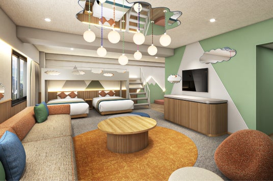 ファミリールームは、霧島山や雲をモチーフにしたお部屋<空>と、朝の光をイメージしたお部屋<太陽>の2タイプ。遊び心あふれるデザインがお子様にも親しみやすく、室内でも、旅の思い出に残る一枚を撮影いただけます。