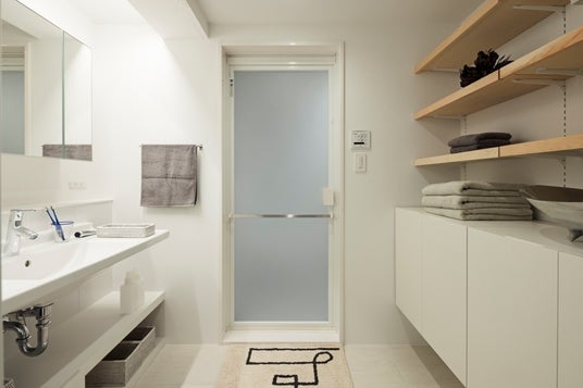 洗濯機置き場はパントリーに配置し、料理と洗濯が同時にでき、バルコニーにもアクセスしやすい工夫です。洗面スペースには、幅が広く、並んで使えるスタイリッシュな陶器の洗面器を採用。洗面室は洗濯機スペースがない分広くなり、背面の可動棚にタオルや日用品などもたっぷり収納することができます。玄関は、間口を広げ、並んで靴を脱ぎ履きすることができます。玄関正面にはベビーカーやアウトドア用品まで収納できる大容量のSICを設け、多様なライフスタイルに対応しました。玄関横の壁に設置したのは、開発中の新オプションである木製ボードで、アートやフックを設置して帽子や鍵をかけたり、DIYでフレキシブルにお使いいただけます。