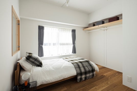 洋室は7.4帖と5.0帖の2部屋。リビング側の洋室には室内窓を設け、光と風が心地よく通る設計に。縦横で2メートルの幅があるので、ベッドの向きが横でも縦でも並べられる嬉しい設計。7.4帖の洋室は将来的に空間を仕切って使えるよう、引き戸を2箇所に設置し、ライフスタイルの変化に柔軟に対応します。洋室とLDKをつなぐ廊下にはWICを配置。ハンガーパイプや可動棚を備え、衣類から本、小物まで効率的に収納できるように設計されています。