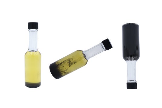 瓶をひっくり返すと黒一色に変わる衝撃的な見た目に仕上げ、ラベルやキャップも黒で統一。