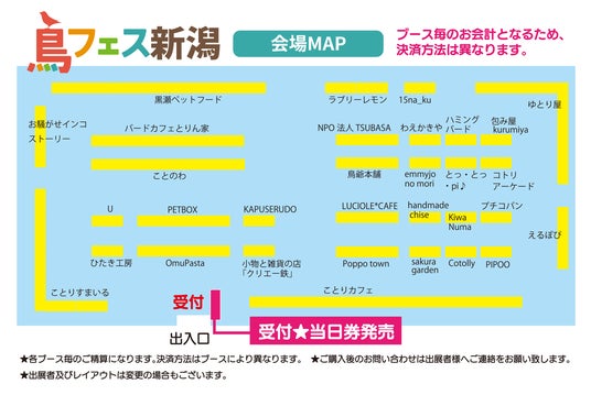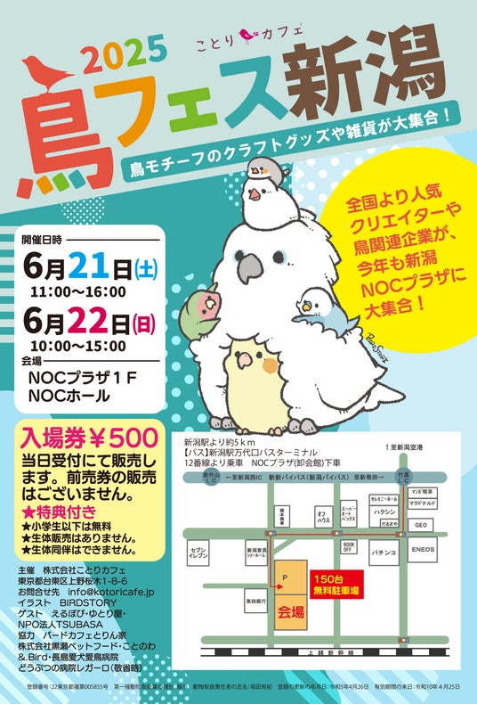 「小鳥たちを眺めながら、まったりコーヒータイム♪」をコンセプトにした「ことりカフェ上野本店」(http://kotoricafe.jp/)を運営する株式会社ことりカフェ(本社:東京都台東区 代表取締役 川部志穂)は、今週末の6月21日(土)・22日(日)に、新潟駅より約5km「NOCプラザ・1階NOCホール」(https://www.noc-plaza.com/)にて、"鳥好きによる鳥好きのためのフェスタ"「鳥フェス新潟」(主催:ことりカフェ)を開催いたします。全国から人気クリエイターが集合し、色とりどりの小鳥モチーフの作品を対面販売。株式会社黒瀬ペットフード(https://www.kurose-pf.co.jp/)や鳥爺本舗による小鳥のご飯も販売。地元で人気の鳥カフェ「バードカフェ とりん家」や大阪の鳥カフェ「ことりすまいる」も出店。カワイイグッズで埋め尽くされた会場へぜひお越しくださいませ。