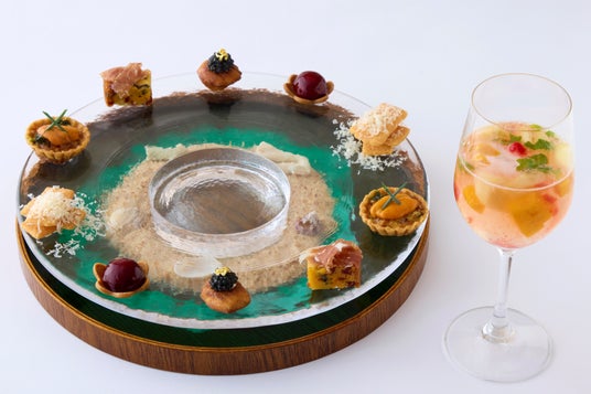 小さなひと口にこだわりが詰まったセイボリー(左)、飲み進めると色が変化する、桃のカクテル(右)