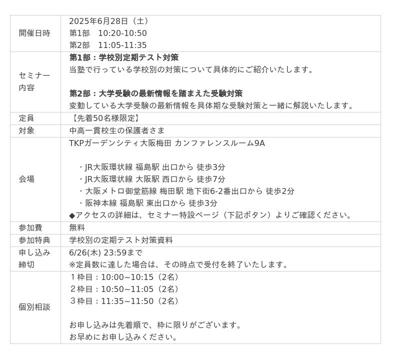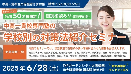 株式会社メイツ(本社:東京都新宿区 代表取締役:遠藤尚範)が運営する『中高一貫校専門 個別指導塾WAYS(以下、WAYS)』では2025年6月28日(土)に梅田にて、中高一貫校に通う生徒・保護者さまを対象とした、学校別の対策法紹介セミナーを開催いたします。
