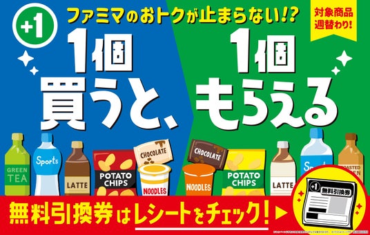 株式会社ファミリーマート(本社:東京都港区、代表取締役社長:細見研介)は、継続して取り組んでいる5つのキーワードの一つである「たのしいおトク」の一環として、期間中、対象商品を1個購入すると、対象商品と引き換え可能な無料引換券(レシートクーポン)を1枚プレゼントする「1個買うと、1個もらえる」キャンペーンを、全国のファミリーマート約16,300店舗で開催しております。キャンペーン3週目となる2025年6月17日(火)から6月23日(月)までは、「グリーンダカラやさしい麦茶 680ml」を買うと、「サントリー天然水 1L」がもらえるを目玉商品としてご用意しているほか、「堅あげポテトうすしお味」「ポッキーチョコレート」「ジョージア カフェラテ 500ml」など、人気商品18品が発券対象となります。