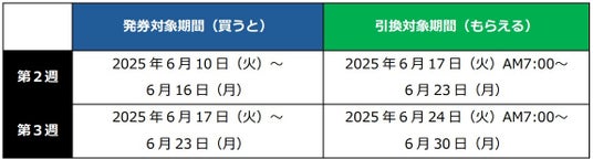 また、2025年6月10日(火)から6月16日(月)の第2週発券対象期間中に対象商品をご購入された方は、6月17日(火)AM7:00から対象商品の引き換えが可能になります。