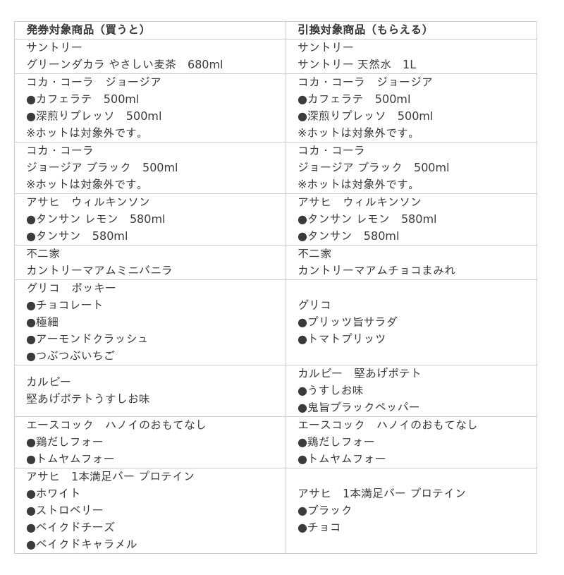 6月17日(火)からは目玉商品として「グリーンダカラやさしい麦茶 680ml」を買うと、「サントリー天然水 1L」がもらえるをご用意しました。買う商品の内容量よりも、もらえる商品の内容量の方が大きくなるおトクな商品となっています。そのほか、発券対象商品に「堅あげポテトうすしお味」「ポッキーチョコレート」「ジョージア カフェラテ 500ml」など、人気商品18品を用意しました。また、翌週6月24日(火)からの引換対象商品には「カントリーマアムチョコまみれ」や「プリッツ旨サラダ」など、ランチやおやつに嬉しい15品をラインアップしております。