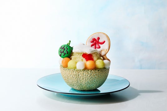 毎年、好評を博しているシャングリ・ラ 東京のメロンかき氷が今年もお目見えします。今年は日本の夏の風物詩、夏祭りをイメージして作りました。かき氷はホテルのシグネチャーでもある100%フレッシュメロンジュースを凍らせ、削っているため、最後まで約1個分のメロンをおいしく楽しめます。国産メロンは半分にカット、中身をくり抜いて、杏仁豆腐、わらび餅と大納言を入れ、ジャージーミルクアイスを乗せました。その上にメロンかき氷を盛り、トロッとしたホイップクリームを絞っています。丸くくり抜いたマスクメロンと赤肉メロン、白玉で彩り、スイカをイメージしたマカロンをあしらいました。マカロンの中にはスイカの果肉を想起する赤いいちごのガナッシュが入っています。お祭りに欠かせないうちわのアイシングクッキーには「氷」の文字を、金魚すくいの金魚はハイビスカスゼリーで表現しています。メロンかき氷にギュッと詰まった日本の夏祭りのノスタルジーとシャングリ・ラ 東京のコラボレーションを心ゆくまでご堪能ください。