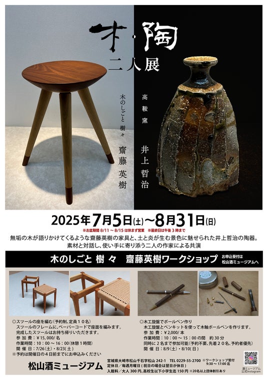 2025年7月5日(土)~ 8月31日(日)松山酒ミュージアム(宮城県大崎市松山)にて『木・陶 二人展』を開催します。