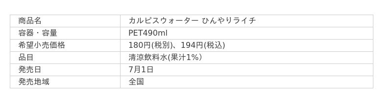 『カルピスウォーター ひんやりライチ』7月1日発売