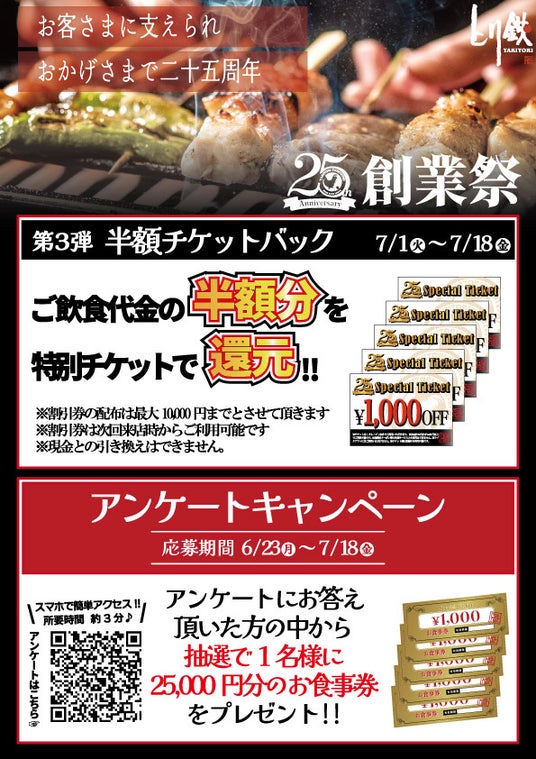 期間:2025年6月23日(月)~7月18日(金)アンケートにお答えいただいた方から抽選で1名様に25周年にちなんで25,000円のお食事券をプレゼントいたします。