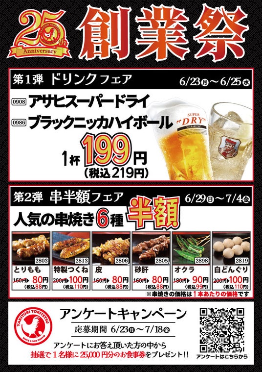 『とり鉄』は、本年6月で創業25周年を迎えることとなりました。こちらを祝し、感謝の意味を込めて 6月23日(月)から『とり鉄25周年大創業祭』を開催いたします。