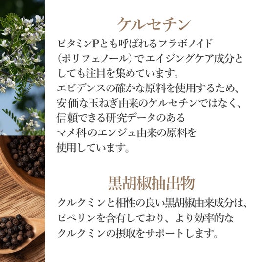 (2)ケルセチン(100mg/日)(3)黒胡椒抽出物(5mg/日)ビタミンPとも呼ばれるフラボノイド(ポリフェノール)でエイジングケア成分としても注目を集めています。エビデンスの確かな原料を使用するため、安価な玉ねぎ由来のケルセチンではなく、信頼できる研究データのあるマメ科のエンジュ由来の原料を使用しています。