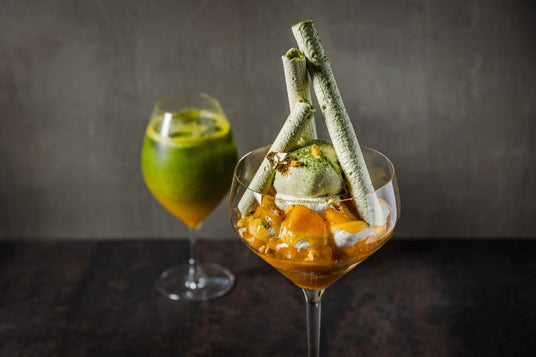 日本茶とマンゴーのティラミスパフェ Parfait au the vert japonais et tiramisu a la mangue