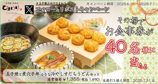 この度、玉子焼・お出汁ひまわり公式Xアカウントとフォロー&リポストして応募すると、抽選で40名様に「玉子焼と煮穴子丼 小さな冷やしすだちうどんセット1人前(税込み1,490円)」をお召し上がりいただけるデジタルお食事券プレゼントキャンペーンを2025年6月18日(水)より開催します。この機会にぜひご応募ください。