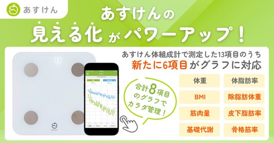 累計会員数1,200万人超・国内No.1*¹のAI食事管理アプリ『あすけん』を開発・運営する株式会社asken(東京都新宿区、代表取締役社長 中島洋、以下「当社」)は、オンラインストア「あすけんSHOP」にて発売中の「あすけん体組成計」で測定できる体組成データ13項目のうち計8項目が、アプリ内でのグラフ表示に対応したことをお知らせします。