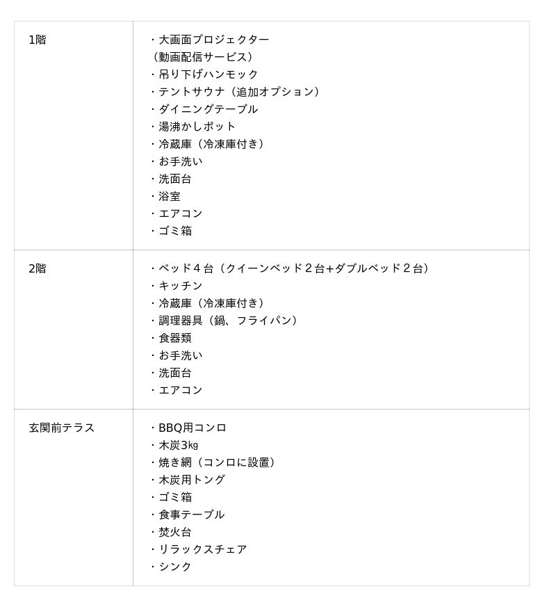 1階には、大画面プロジェクター(動画配信サービス対応)、吊り下げ式ハンモック、追加オプションでご利用いただけるテントサウナなどをご用意しております。2階には、クイーンベッド2台とダブルベッド2台を備えたベッドルーム、キッチン、冷蔵庫など、快適なご滞在に必要な設備が整っております。