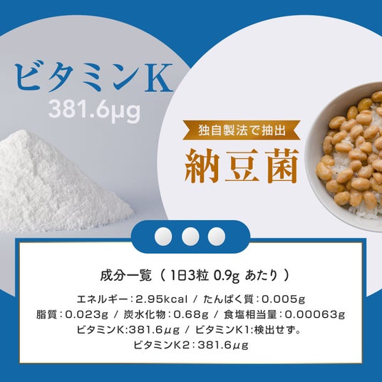 1日たったの3粒を服用することで納豆の重要な栄養素である、納豆菌とビタミンK2が摂取できます!