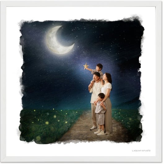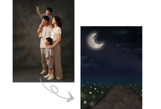 家族はもちろんお子様一人やきょうだいで、三日月を見上げるようなポーズで撮影していただきます。その画像と絵本のような背景イラストを合わせて演出を加えたらできあがり。