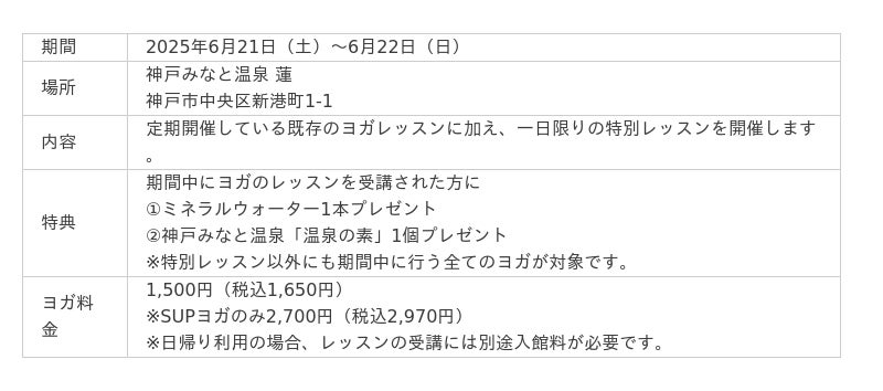 神戸みなと温泉 蓮(総支配人:横山 秀樹、所在地:神戸市中央区)は、6月21日の「国際ヨガデー」に合わせ、2025年6月21日~22日までの2日間限定で、ヨガイベント「国際ヨガデー for REN YOGA」を実施します。
