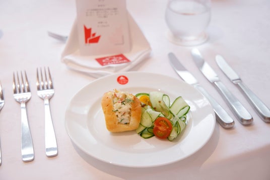 続いて、パビリオン内のカンファレンスルームでは、カナダ人シェフによる9種類のカナダ産食材(メープルシロップ、ビーフ、ポーク、ロブスター、ブルーベリー、はちみつ、パプリカ、トマト、カノーラ)を使用したスペシャルコース料理が振る舞われました。
