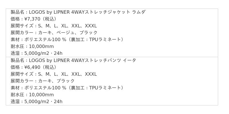 また、「LOGOS by LIPNER 4WAYストレッチレイン ラムダ&イータ」が当たる「ピックアップロゴス プレゼントキャンペーン」では、ロゴス公式Xをフォロー&リポストすることで、抽選で2名様に「LOGOS by LIPNER 4WAYストレッチレイン ラムダ&イータ」を上下セットでプレゼントいたします。ぜひご応募ください。