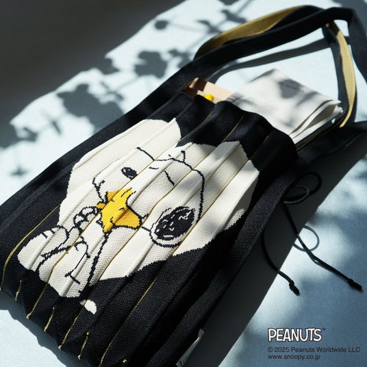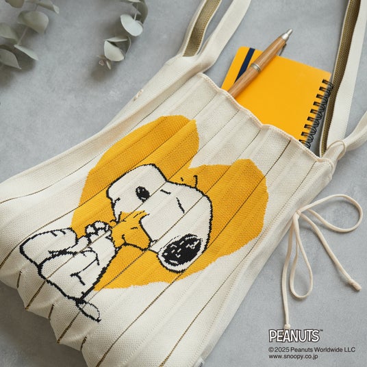 今回登場するのは、ブランドを代表するアイコンバッグ「ラッキープリーツニット」をベースに、スヌーピーとその親友ウッドストックがデザインされたスペシャルエディション。