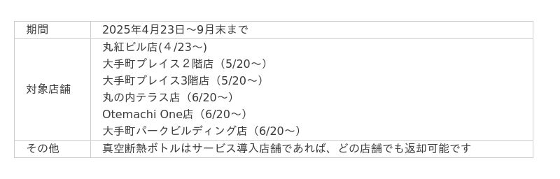 「WELLCUP」は、リユースサービスが選択肢の一つとして皆さまの身近な存在となるべく、サービス体験や機能面の向上を目指して、3社が連携し実証実験を開始いたしました。実証実験は9月末までの約半年間、タリーズコーヒーの大手町エリア6店舗にて実施され、真空断熱ボトルはサービス導入店舗であれば、どの店舗でも返却が可能です。