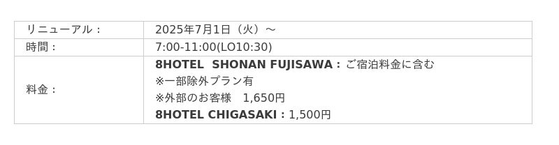 2025年7月1日(火)より、8HOTEL (SHONAN FUJISAWA、CHIGASAKI)の朝食メニューがリニューアルいたします。8HOTEL CHIGASAKIでオープン以来好評の、具だくさんスープを主役にした、スープバーを設置。オリジナルスープ全20種類から3種類を日替わりでご用意し、毎朝ちがう美味しさをお楽しみいただけます。