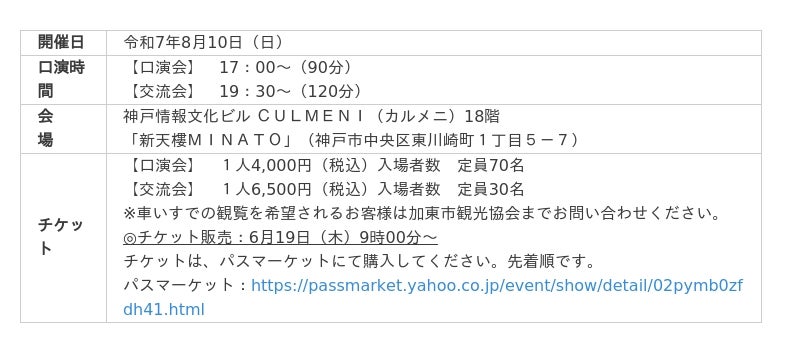 d122852-9-bbbba84d006cc548578e64eb65516836.pdf加東市&北播磨の観光と物産フェア前夜祭イベントとして、怪談師 城谷 歩 氏をお迎えして怪談イベント『怖めに』を神戸情報文化ビル CULMENI(カルメニ)18階「新天樓MINATO」(神戸市中央区東川崎町1丁目5-7)にて口演します。