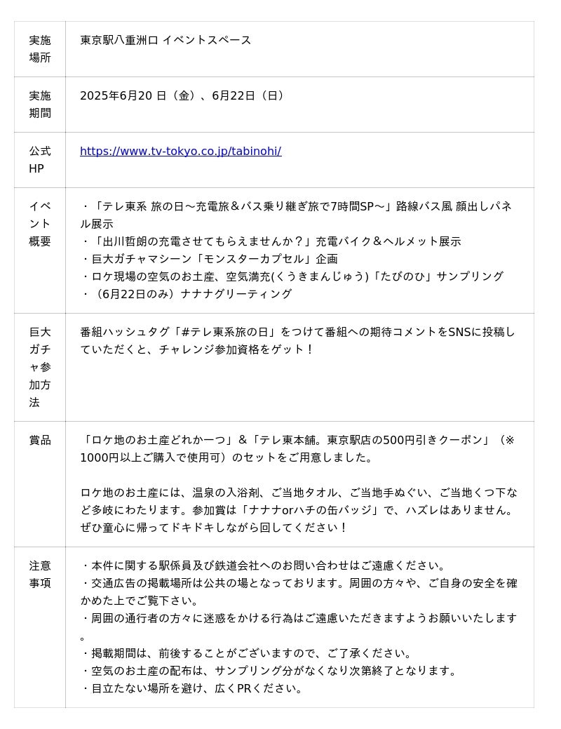番組放送直前の6月20日(金)、第2夜放送当日の6月22日(日)には、東京駅八重洲口イベントスペースにて「テレ東系 旅の日」をさらに盛り上げる催しを実施!