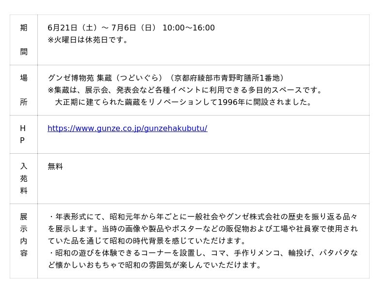 グンゼ株式会社は、創業の地である京都府綾部市のグンゼ博物苑にて、6月21日(土)から特別展「昭和100年展」を開催します。