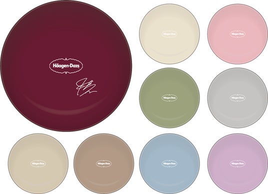 「大切な人とならんで食べよう 絶対もらえるキャンペーン」では、ハーゲンダッツをご購入いただいたお客様にもれなく「メラミン皿2枚セット」をプレゼントします。ご応募いただく際、全9色のうちから、お好きな色をおひとつお選びいただけます。ブランドカラーのバーガンディーレッドは佐藤健さんのサイン入りです。