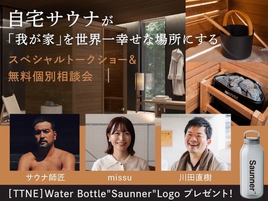 サウナクリエイティブ集団 TTNE株式会社(本社:東京都港区、代表取締役:松尾大)は、2025年6月28日(土)に積水ハウス株式会社の展示施設「スムフムテラス自由が丘」にて、無料トークショー《自宅サウナが「我が家」を世界一幸せな場所にする》を開催します。サウナのある暮らしに関心を持つ若いファミリー層や、マイホーム計画を進めるご夫婦、サウナファン必見のイベントです。