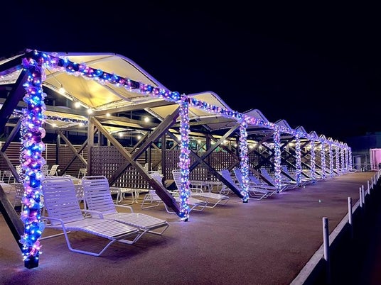 ■かわいく装飾されたナイト限定有料席リボンとイルミネーションで装飾された「グリーンシート」を、ナイトプール開催時間に限り、特別料金で利用できます。特典として場内のフードチケットなどが当たるガチャ用コインが1枚ついてきます。