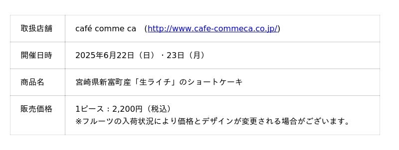 この度、株式会社コムサ(東京都渋谷区)が展開する『カフェコムサ』にて、新富町産のライチをふんだんに使った「生ライチ」のショートケーキが6月22日(日)、23日(月)の2日間限定で登場します。『カフェコムサ』ならではのアート性の高いスイーツで、最高級国産生ライチのプレミアムな味わいをお楽しみいただけます。